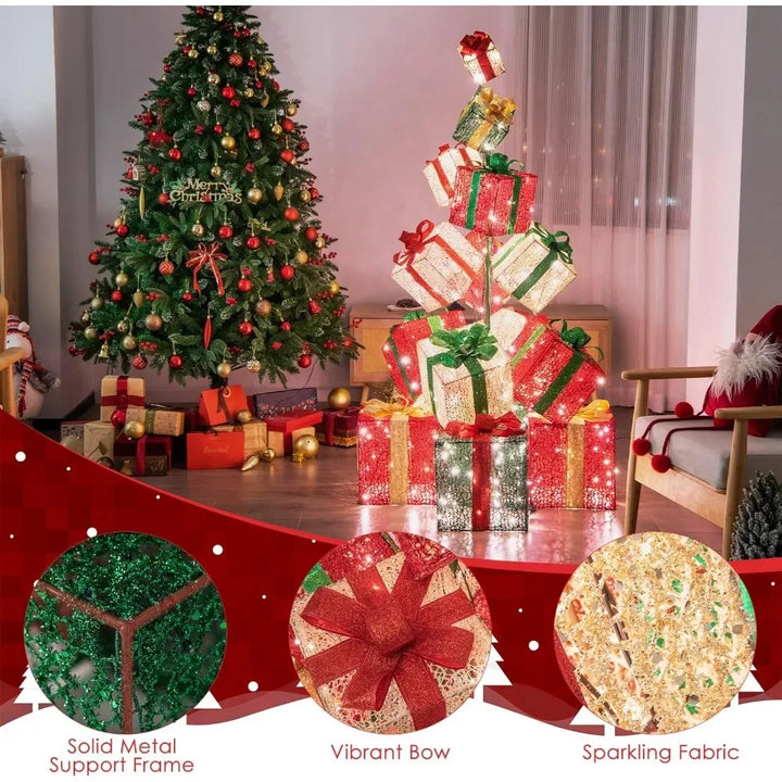 6 FT Lighted Box Tower, 15 Stacked Pre-lit Boxes with 450 Warm White Lights, Metal Base, Ribbons & Bows, Light up Gif